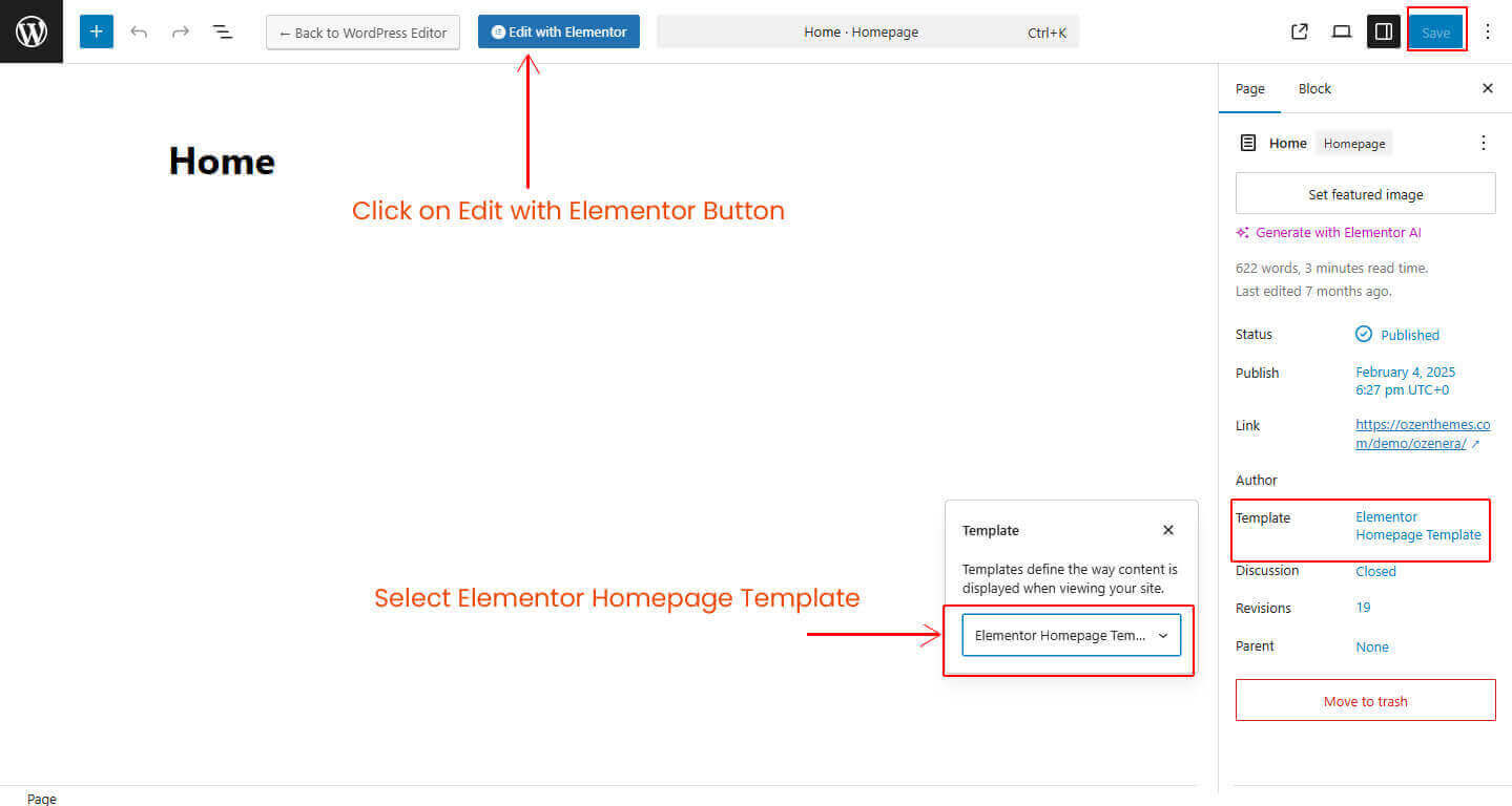 Open Home page(Front Page) and click on Edit with Elementor button.