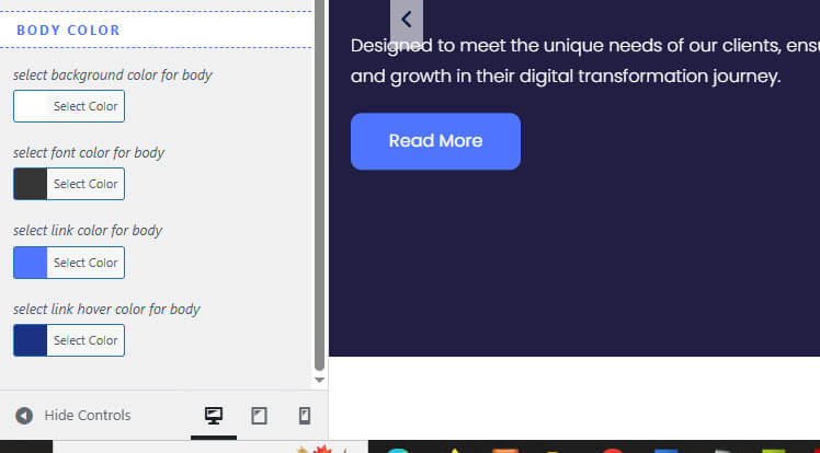 - Go to the Appearance > Customize > Global Settings > Body colors