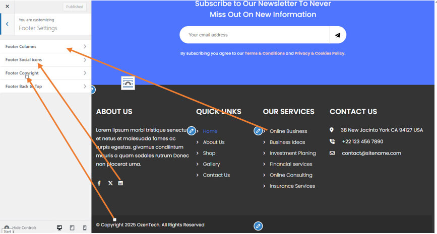 To customize the footer section, go to Appearance > Customize > Footer Settings > Footer Column