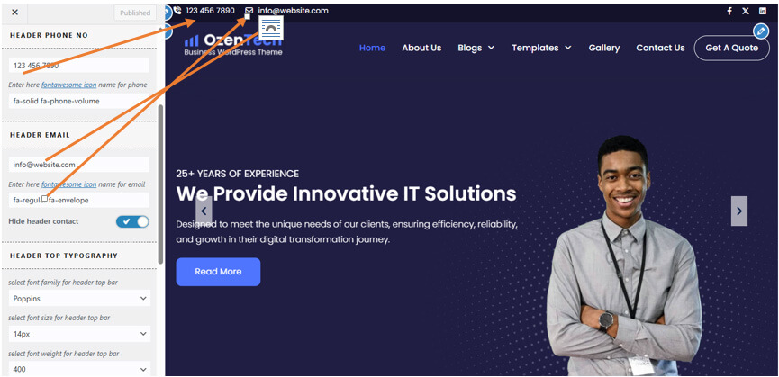 - Can Manage font awesome icons,header background color, font color, link color link hover color and its typography from header top bar sections