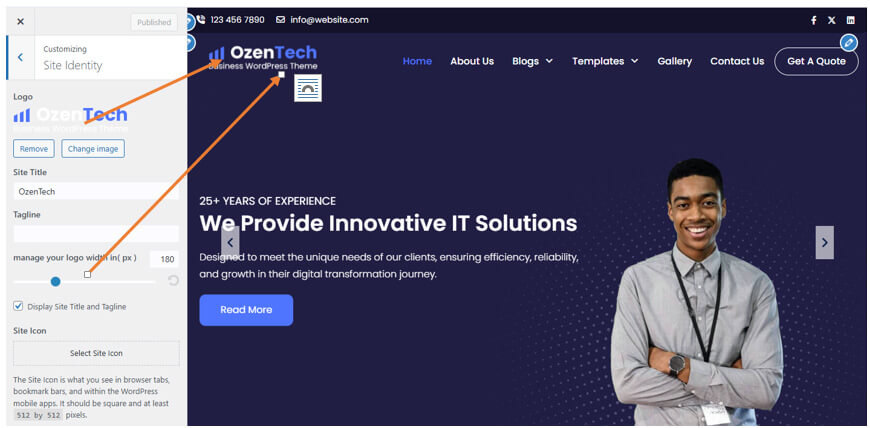 In order to change the Site Title, Tagline and Logo image, follow these steps: