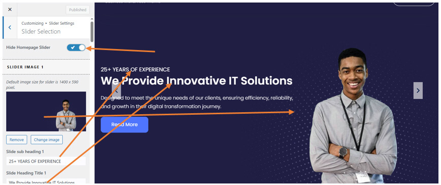 - From your Dashboard, go to Appearance > Customize > Slider Settings > Slider Image Selection