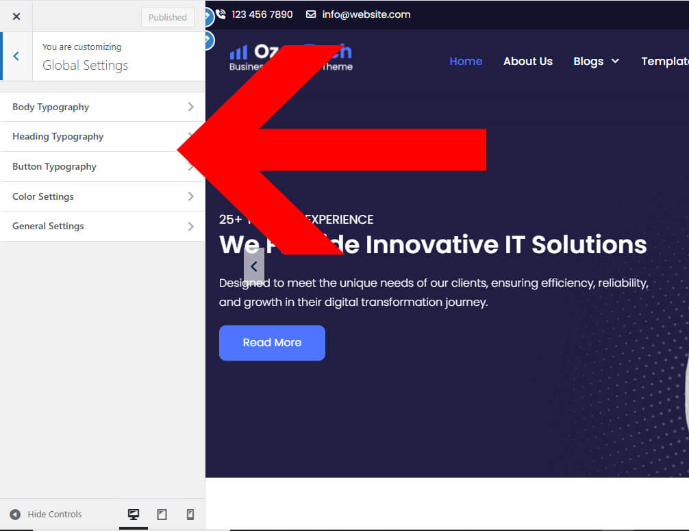 - Go to the Appearance > Customize > Global Settings > Body Typography, heading Typography, Button Typography etc.