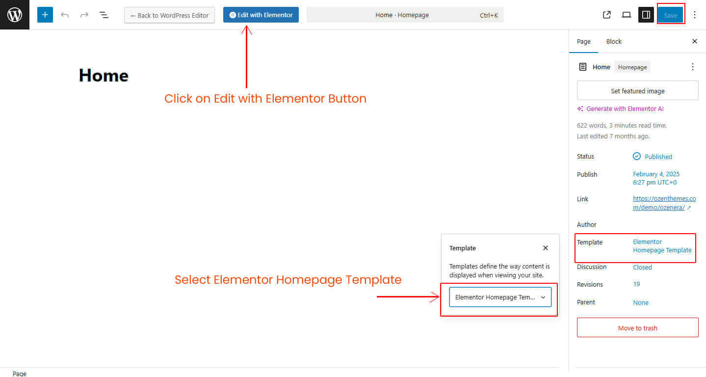 To edit your homepage with Elementor, follow the steps shown below: